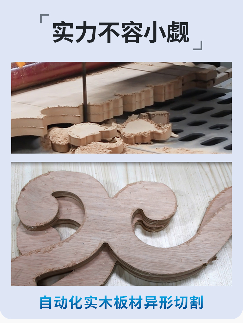2.斷面光潔、加工精度高、速度快,代替?zhèn)鹘y(tǒng)帶鋸切屑死角和拐彎難題以及表面光澤度問(wèn)題,顛覆傳統(tǒng)實(shí)木下料前段工序、畫(huà)線、手動(dòng)開(kāi)料、 鑼銑三道工序,降低人工成本,降低生產(chǎn)事故,提高生產(chǎn)效率。