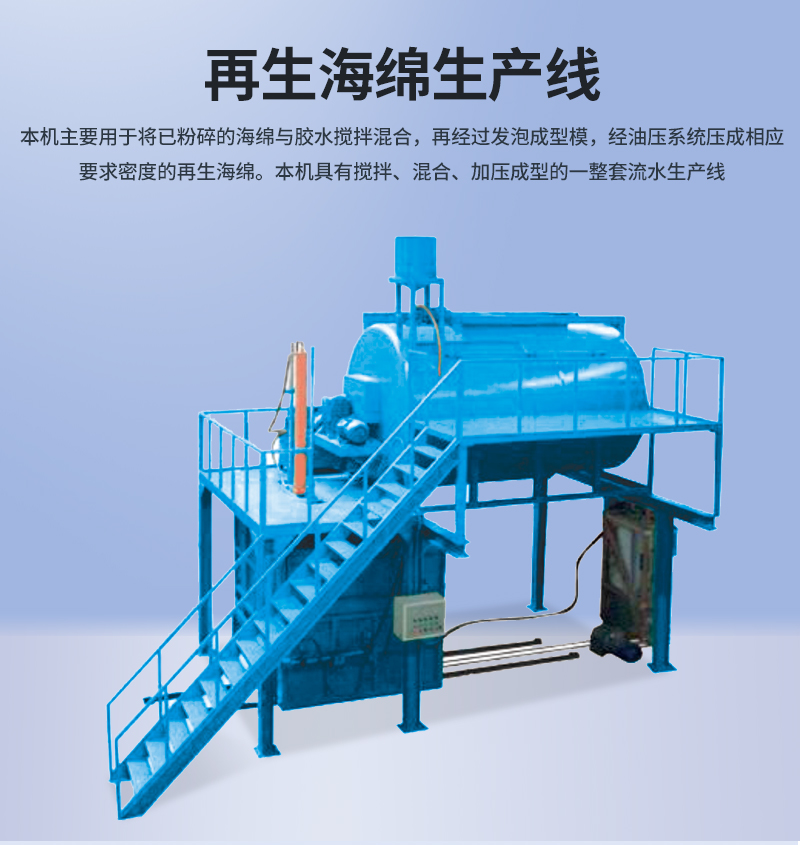 1.本機主要用于將已粉碎的海綿與膠水?dāng)嚢杌旌希俳?jīng)過發(fā)泡成型模具,經(jīng)油壓系統(tǒng)壓成相應(yīng)要求密度的再生海綿。
