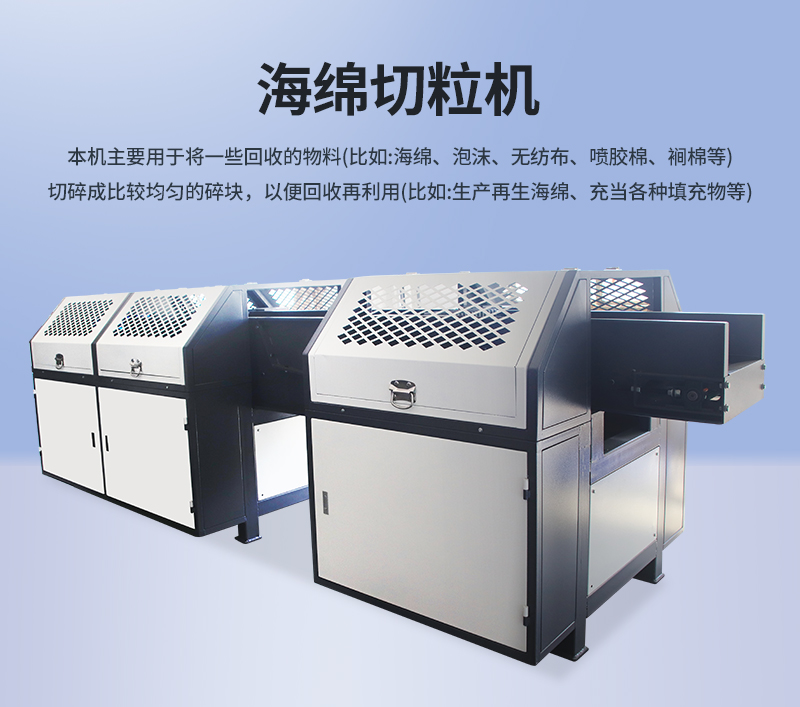 產(chǎn)品介紹: 1.本機主要用于將一些回收的物料(比如:海綿、泡沫、無紡布 、噴膠棉等)切碎成比較均勻的碎塊以便回收再利用。2.該機切刀采用精鋼材料做成,將待加工的物料直接放入機器加工成粒塊狀,廣泛應用于沙發(fā)、床墊、座墊、玩具、隔離包裝材料等行業(yè)。3.機器可選擇二組刀與三組刀,第一組刀將海綿塊切成片狀,第二組刀將片狀海綿切成條狀,第三組刀將條狀海綿切成顆粒狀。4.被切割后的海綿粒寬度為8,長度在5-25MM可調(diào)(根據(jù)客戶需求可訂制)。