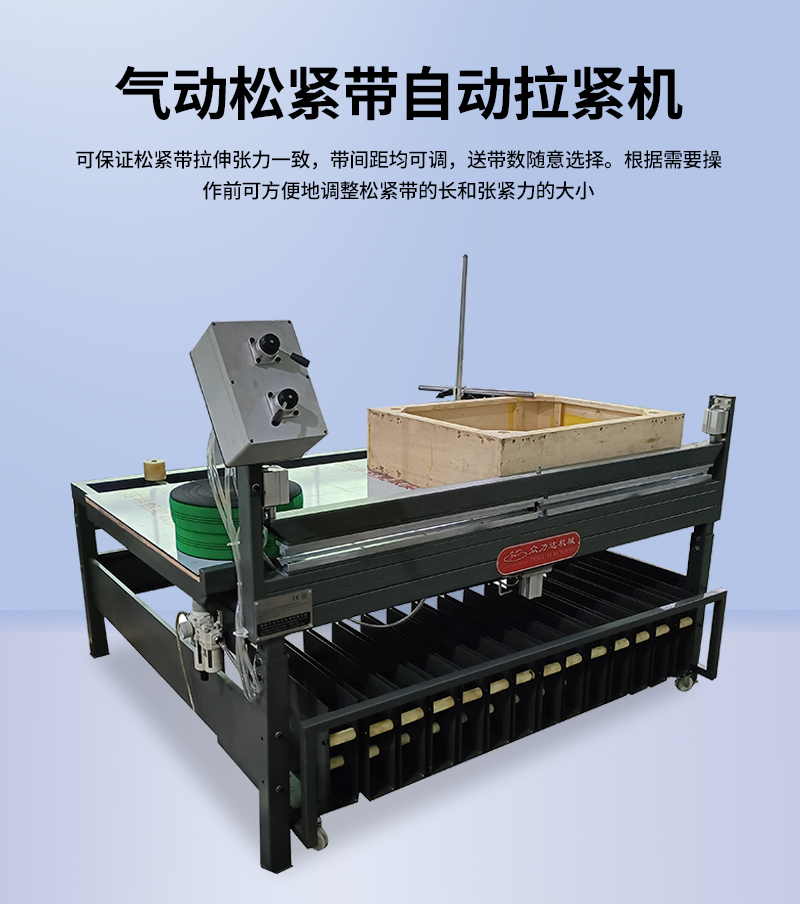 2.操作步驟:送帶(按鈕)、外側打釘、回拉(按鈕)、內(nèi)側打釘、割帶。3.有8條帶電動式松緊帶自動張緊機備選。