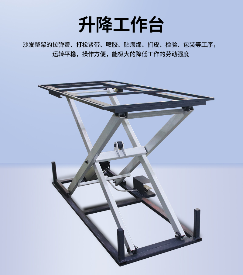 1.氣動升降工作臺沙發(fā)生產(chǎn)廠諸多工序適用,可選擇升降、旋轉(zhuǎn)、腳輪等不同的功能配備。